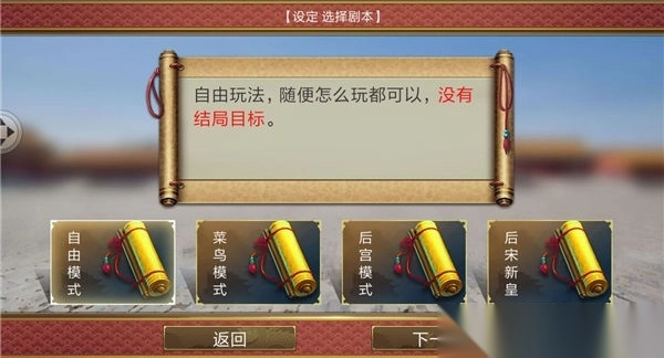 二、模式分为:自由模式、菜鸟模式(暂未开放)、后宫模式、后宋新皇;
