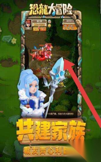 2、进入“共建家族”页,点击箭头指向的恐龙/场景,参与家族任务,和战友协作,建设家族。