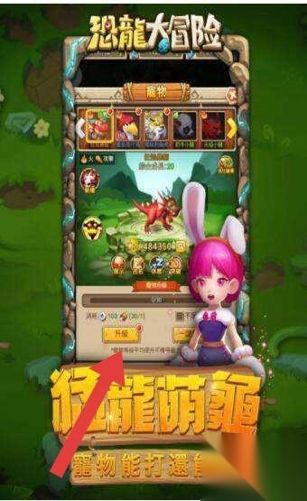 3、在“恐龙萌宠”界面,点击【升级】,提升宠物战力,让宠物“能打还能骑”,助力冒险。