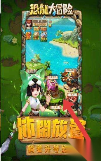 1、在主界面,点击箭头指向区域,参与“休闲放置”玩法,挂机升级,获取资源,强化角色。