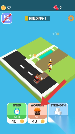 3、升级需40金币、力量(STRENGTH,等级3,升级需40金币)的属性显示,呈现建筑施工场景,属于休闲模拟建造,玩家可升级属性推进建筑进程。