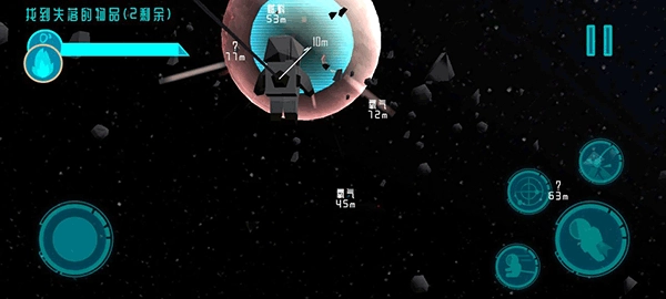 底下就是我们控制小人上下左右移动的方向键,但是小伙伴们要注意,往前推摇杆不是往前走而是网上看哦;然后我们看右边这4个键分别是拉回、雷达、获取物品和往前走,拉回获取物品和往前走小编就不多过多阐述了,雷达扫描可以帮助我们更好找到物品或者延长氧气的道具。