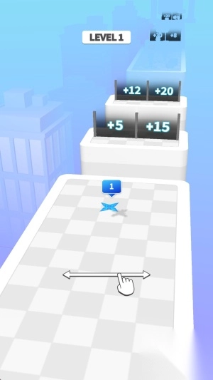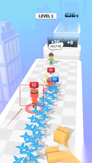 1. 在 LEVEL1 关卡中操控角色向前行进,要留意躲开以红色方框标记的蓝色飞镖障碍,优先去触碰“+20”“+8”这类增益数字,以此增加飞镖数量。