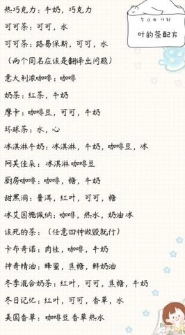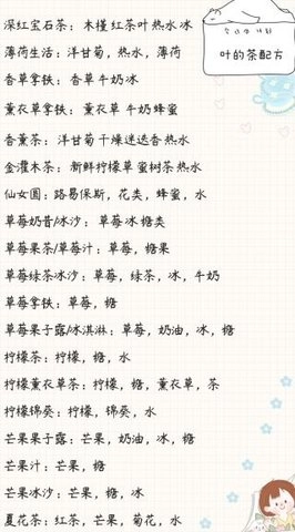 介绍了迷迭香茶、薄荷茶、柠檬草茶、烂茶叶茶、鲜茶叶茶、乌龙茶,以及包含帮助花瓣、勇敢茶等在内的多种茶叶饮品的配方 。 不过你这里提到的“帮助花瓣”“勇敢茶”表述比较奇特,如果有更准确含义可进一步告知以便优化。