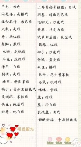 对米色毛线、马苏里拉色线、拿铁线、灰尘线、烤面包线、午后阳光线等各类毛线的配方进行了介绍。