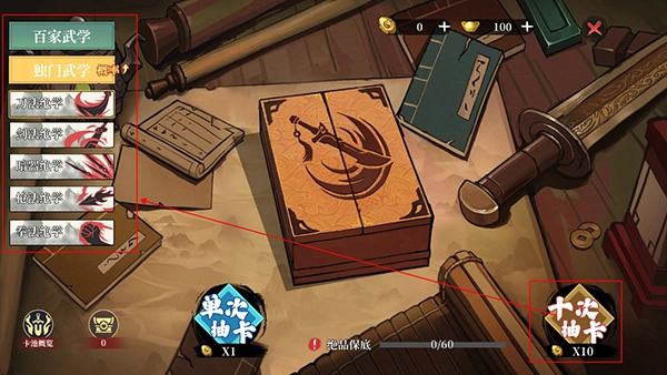 3、玩家可以在武道阁进行百家武学和独门武学的抽取。