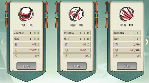 4、玩家也能够对侠客的刀法、剑法、暗器、枪法、拳脚、身法、心法这七大属性展开修炼并使其得到提升。