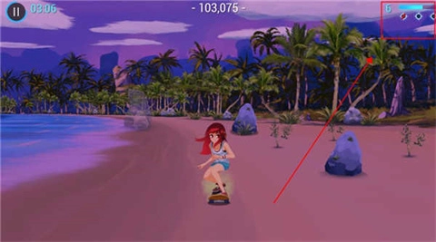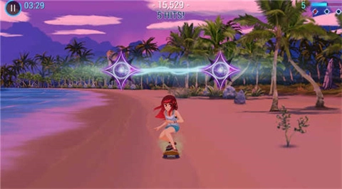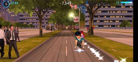3、游戏开场,是一个男孩背着女孩借助滑板展开跑酷。当出现这种闪光时,玩家要通过左右滑动去触碰闪光以获取分数,触碰得越多,得分也就越高。
