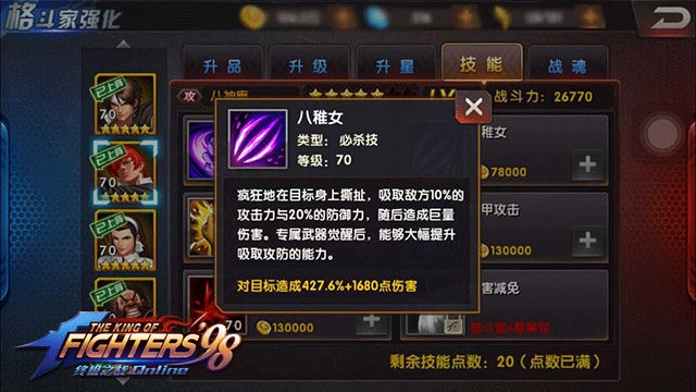 《拳皇98终极之战OL》官方正版独具创新的QTE连击战斗玩法,为玩家带来极致紧张刺激的动作游戏体验。不仅如此,游戏内包含天赋、神器等战斗培养要素,玩家能够对自己的格斗家进行升级,还可参与社团战、拳皇争霸、跨服争夺战等PVP玩法。