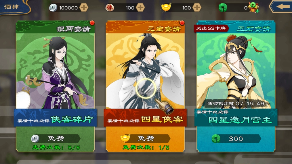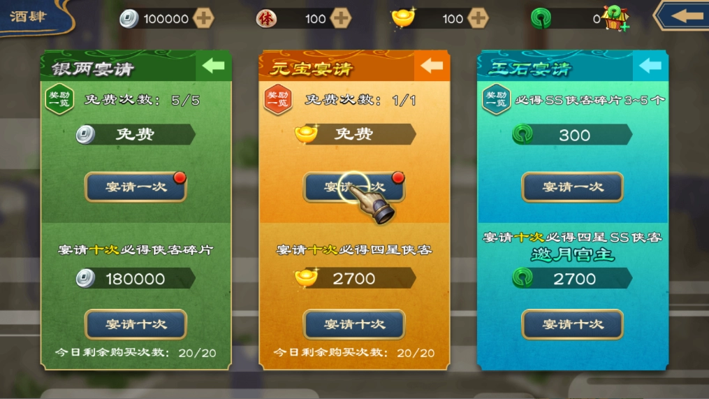 4、点击宴请一次,这个属于引导教程,出什么都是固定的,玩家随便点就是。