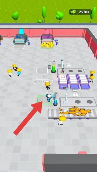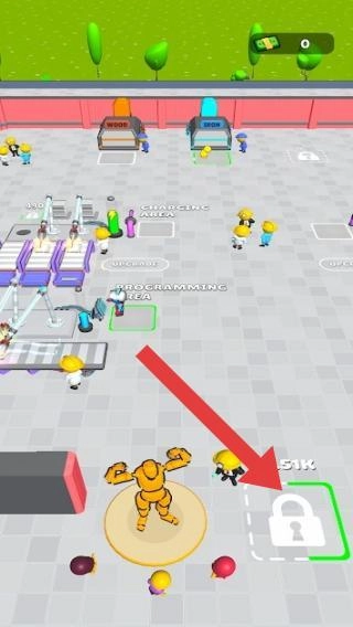 1. 展现工厂场景,设有“PROGRAMMING”等区域。玩家能够在其中经营工厂、研发机器人。图里箭头所指为待解锁区域,玩家可体验从建设到生产的模拟经营全过程,这属于创意工厂经营类玩法。