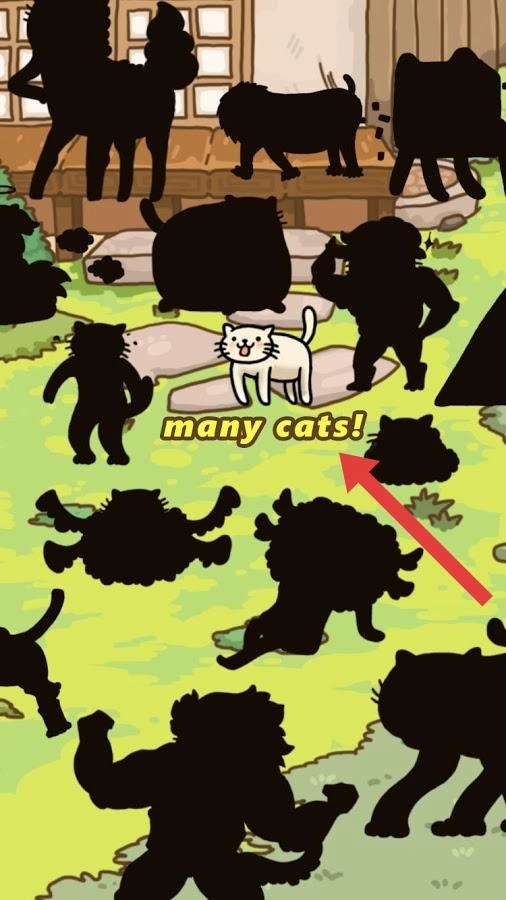 1、在动物剪影场景中,找到中间的白猫,结合【manycats】提示,互动开启收集或进化流程。