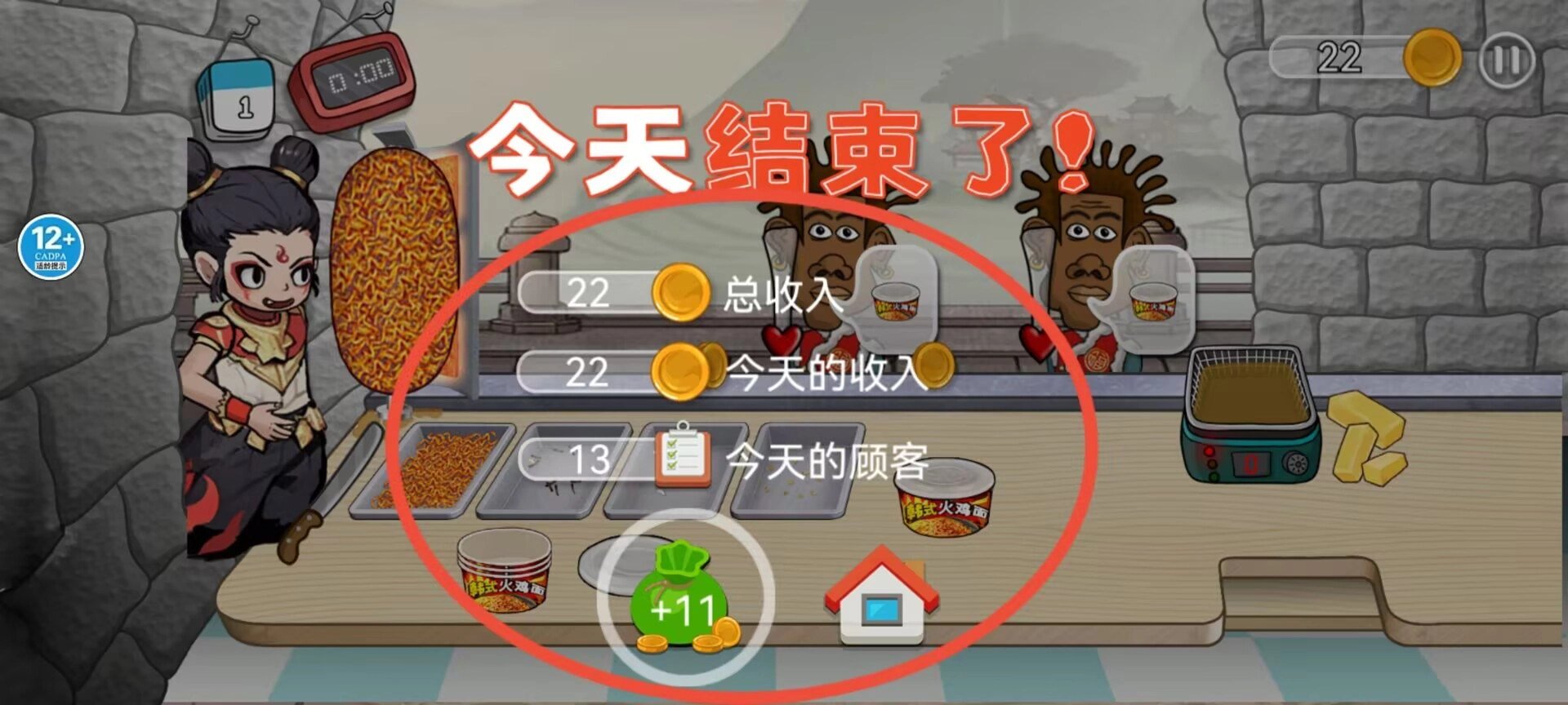 3、每日营业结束后进入结算界面,统计当日总收益、新增收入及客流量数据,确认后返回主界面保存进度。