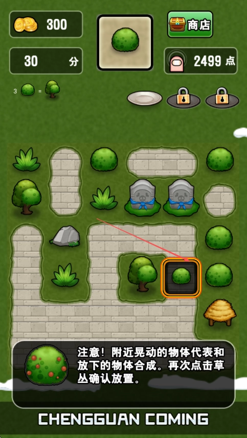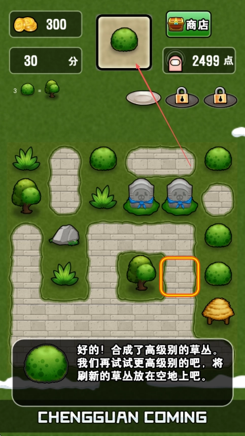 1. 进入游戏时,注意观察左上角的金币与分数。接着点击上方的草丛图标,把草丛放置到场景中的空地上,随后开始进行合成操作。