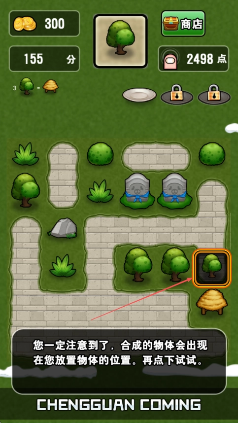 3、接着进行合成操作,留意合成物体的位置规律,再次点击并放置,以合成更高级别的树木等物体。