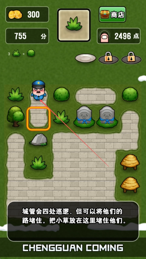 4、待城管现身,迅速点击小草,放置于城管的巡逻路线上,阻拦城管,防止其对合成造成干扰。