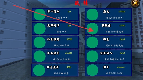 3、轻点成就按钮,便能查看各类成就任务。比如要完成“第一滴血”成就,需通关第一关,一旦达成成就,即可领取奖励。