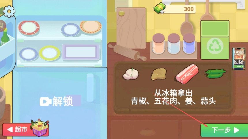 1. 进入游戏,映入眼帘的是厨房场景。按照提示,从冰箱中取出青椒、五花肉、姜以及蒜头,随后点击“下一步”。
