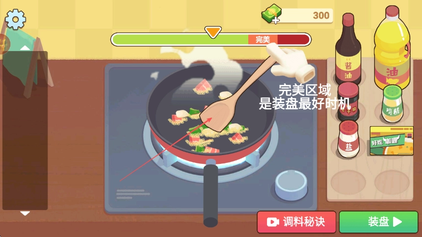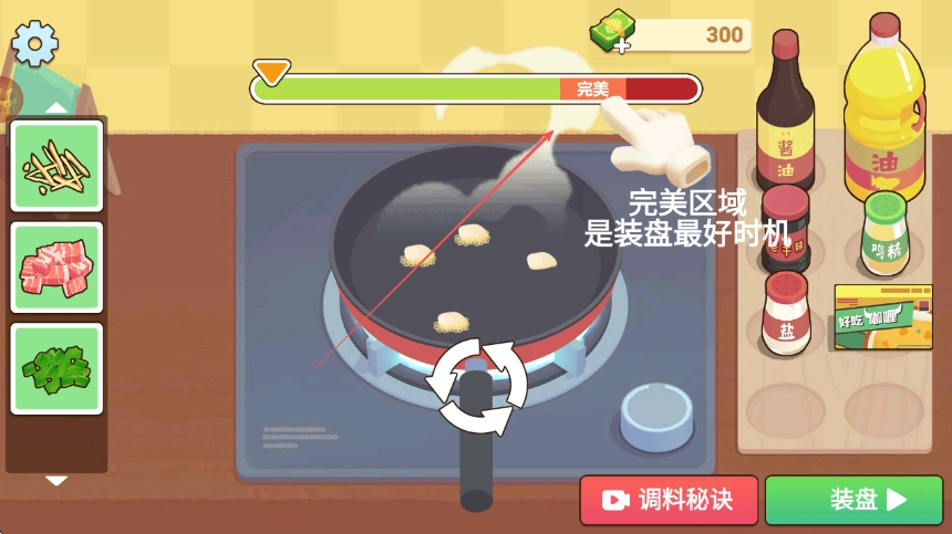 3、把食材放入锅中进行烹饪,留意进度条,当指针抵达完美区域之际,便是装盘的最佳时刻。