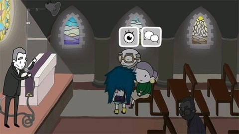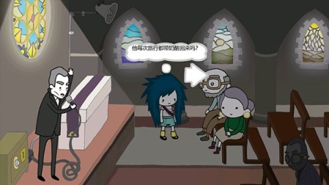 9、结束对话后,去查看墓园中的物品,接着返回教堂与妈妈交谈,最后再回到肉店。
