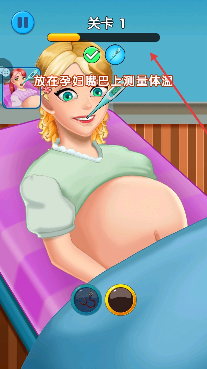 1. 当进入【关卡1】,看到“帮助孕妇!”的提示时,点击屏幕下方的医疗工具图标展开操作。