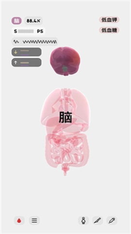 8、人体模型的异常状态,如低血钾和低血糖,显示在右上角。
