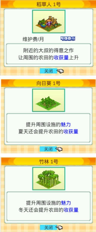 除了使用道具,打造适宜的环境设施同样能够提升作物产量。稻草人在增加产量方面效果显著。另外,部分环境设施会依据季节对产量予以加成,像竹林能提高冬季收成,向日葵能提高夏季收成等。