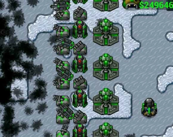 防空炮:售价600元,仅能对空中目标(也就是飞机)发动攻击,它所发射的是跟踪导弹,能够紧紧追着飞机四处飞行。要是你愿意再花900元,就能将其升级到2级,也就是顶级。这可是个专门用来“拿捏”AI智商的利器,对空能力极其出色,攻击范围也很广,堪称打飞机的不二神器。把它建在炮塔旁边,就能实现对陆地和空中的双重防御。面对单个飞机,它处理起来毫不费力。不过,要是碰到一群轰炸机,它就有点力不从心了。好在AI的智商有限,无需担忧会遭遇AI的地毯式轰炸。