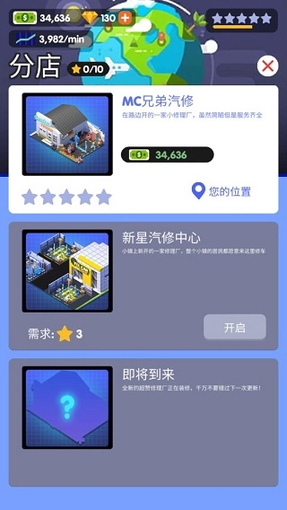 3、在游戏里,你得打造一个属于自己的连锁品牌,持续扩大修理店的规模。
