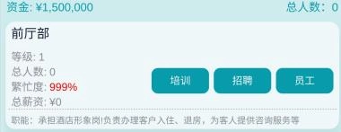 模拟经营大酒店是一款以文字形式模拟现代酒店管理与经营的游戏。在游戏里,你需要招募更多员工,并为他们妥善安排职位,像清洁人员、前台接待、保安、经理等等。而你将扮演大老板,掌控酒店的发展方向。