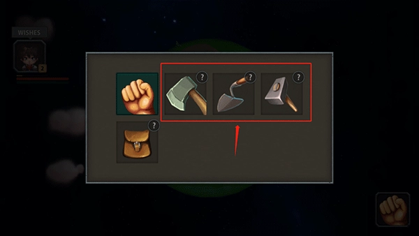 4、想要制造更多有用的工具,玩家需要去采集需要的资源,而有些资源需要对应的工具才可采集,比如锤子采集石头,斧子采集木材等等,这些工具都可以制造出来,首先点击星球上的帐篷