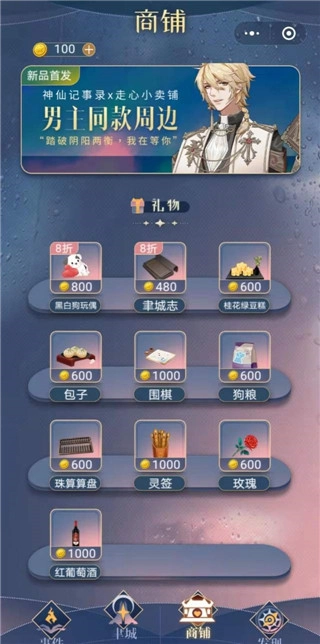 觉得羁绊值增加得太少?点击“商铺”,使用做任务获取的【金币】购买礼物,送给你喜欢的男主就行。不同礼物增加的羁绊值有所差异,记得把礼物送给珍视它的人哟。每天都会刷新特价礼物,要是你深谙此道,不妨在特价时大量购入礼物,让金币发挥最大价值~