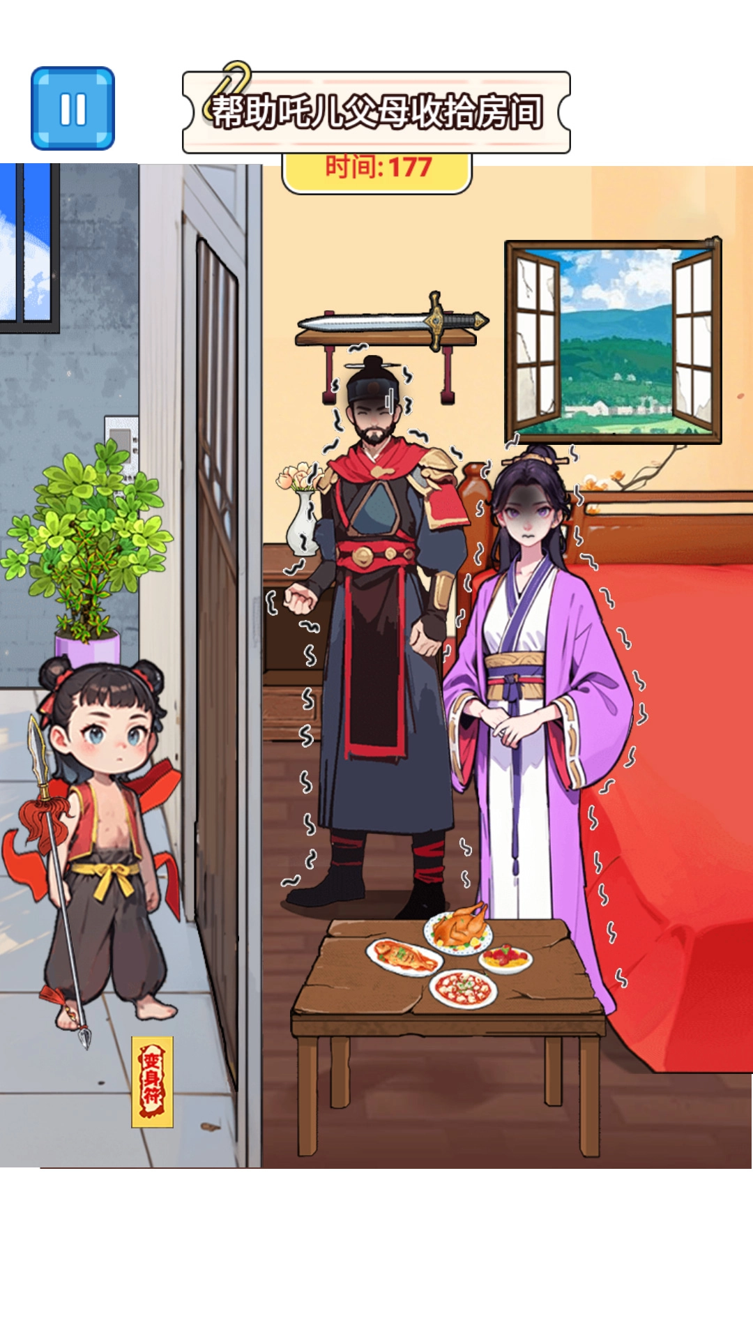 2. 以哪吒为核心进行设计,比如呈现哪吒房间杂乱无章的场景,玩家需要协助整理;同时加入哪吒渡雷劫等包含神话元素的情节。
