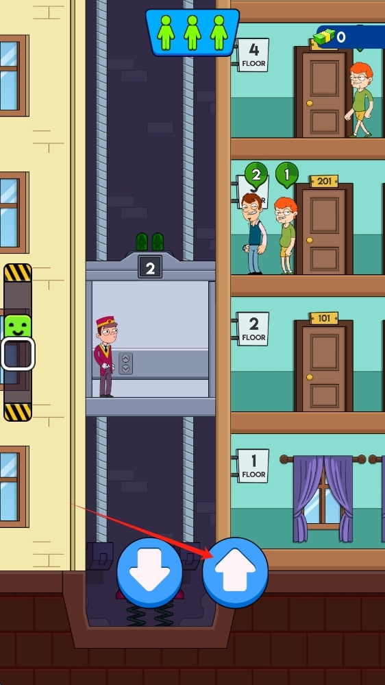 2、在游戏过程中,依据人物所处的楼层,点击向上或向下按钮,精确操控电梯移动,以安全运送人物,之后点击传送电梯。