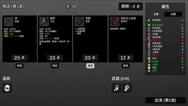 收集经验来提升等级,在每一波敌袭的间隙前往商店获取一些道具。