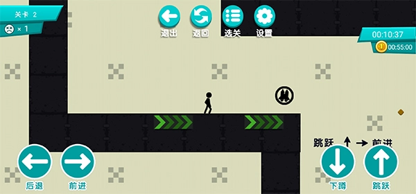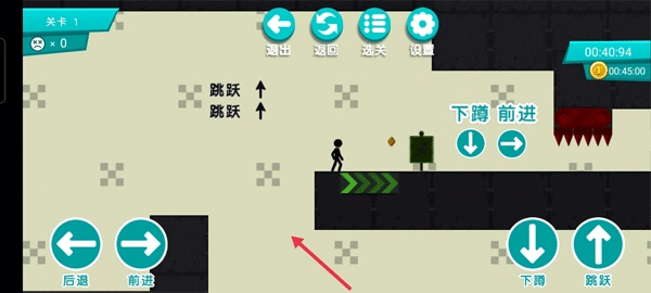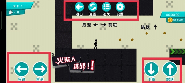 1. 打开游戏后,你会看到仅有一个按钮,点击“开始游戏”。由于此时只有关卡1处于解锁状态,所以点击关卡1便可开启游戏。接下来介绍火柴人挑战的基本功能按键:左边是简单的后退与前进按钮,右边则是下蹲和跳跃按钮。着重介绍一下上面中间的功能,“返回”按钮的作用是,当你陷入某个无法通过的陷阱时,点击它就能返回到游戏开始的场景;“选关”即重新选择开始游戏的关卡;“设置”仅有音响和声音这两种设置选项。右边显示数字的区域,代表着你通关所需的时间以及获取金币数量的目标。