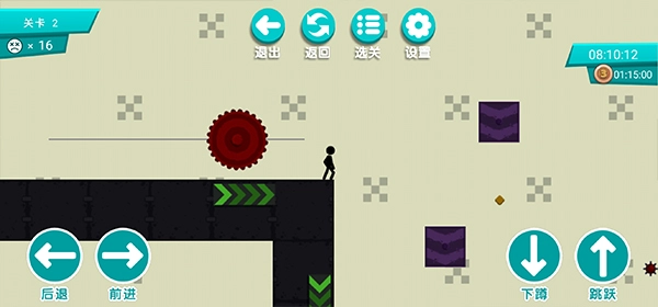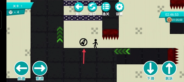 4、另外,当刺位于火柴人上方时,同时按下【前进】与【下蹲】这两个按钮,即可迅速通过该刺。