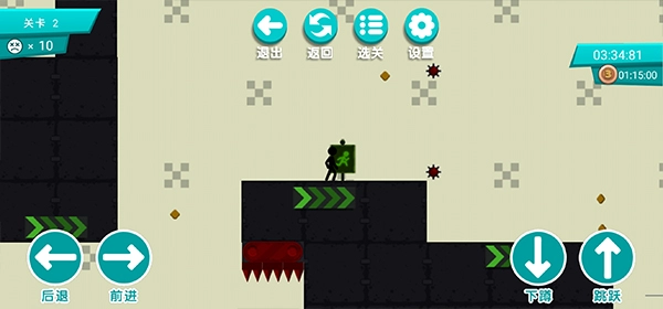 2、接下来为大家介绍基本陷阱的通关技巧。像首页那种下方有刺的地方,可同时按下【前进】与【跳跃】两个按钮来通过。