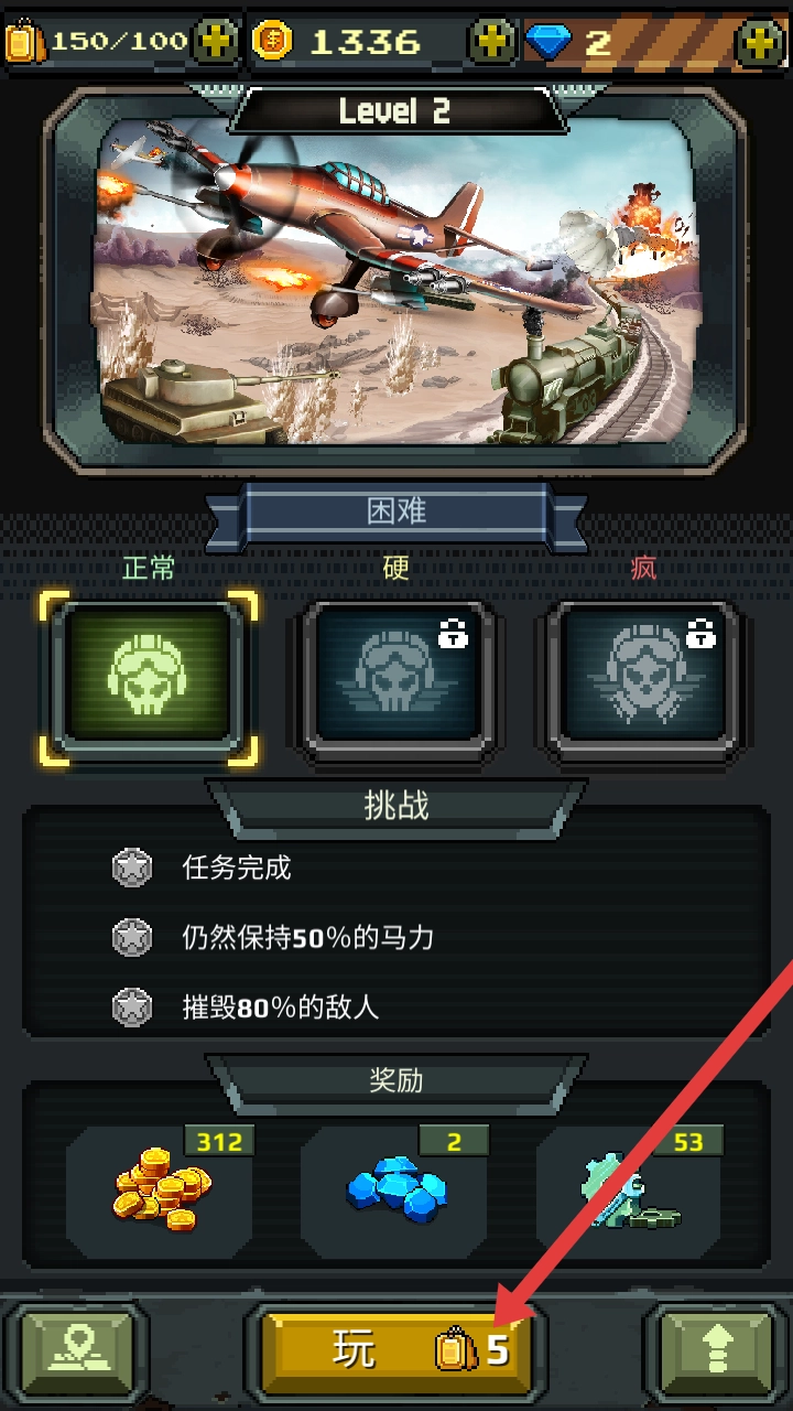 1. 来到关卡选择界面后,点击“玩”按钮。进入Level2困难模式的空战关卡前,要留意本次关卡所需达成的任务目标。