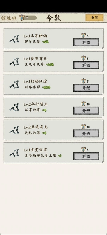 命数相关操作:通过消耗命数点来解锁与升级命数,命数状态每局均可继承,玩家能依据自身需求进行选择。就目前情况而言,其作用不太显著。当存在点数可供分配时,对应按钮会亮起;若没有点数可分配,按钮则呈灰色显示。此外,命数点数支持重置操作,只需点击右上角的重置按钮,即可重新进行点数分配。