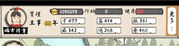 健康状况:红色代表你的血条,一旦血条见底,人物就会死亡。你可以通过在地图上选择「大观园」-「随便逛逛」来增加2点健康值,也可以点击下方的「珍宝」,在珍宝阁观看广告购买左归丸,从而增加20点健康值。