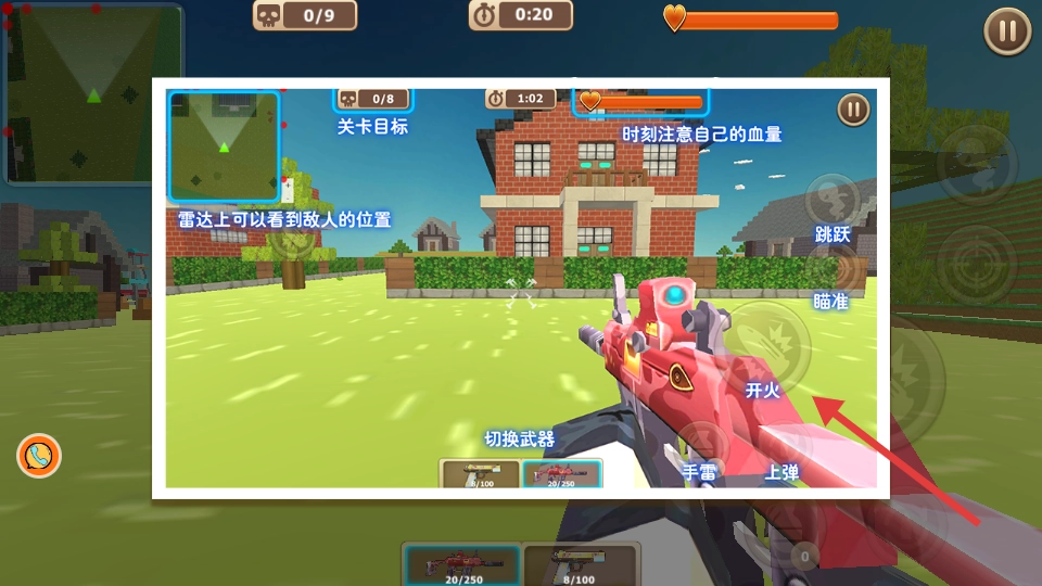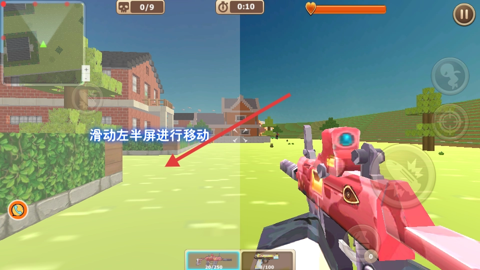 1. 通过左手滑动来操控角色移动,右手点击则可实现瞄准射击动作。