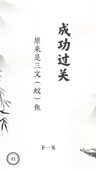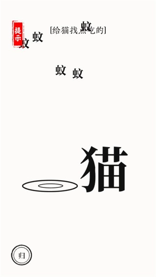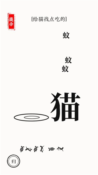 1. 第二关【给猫找点吃的】,第一步是连续点击三个【蚊】字,如此一来,蚊子便会掉落,摔成【文】与【虫】。