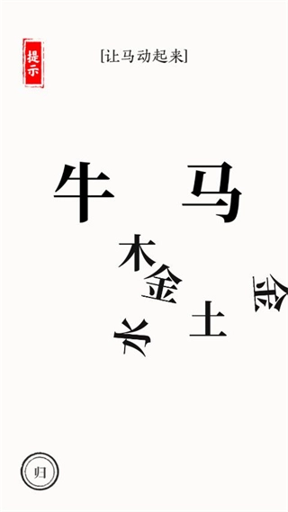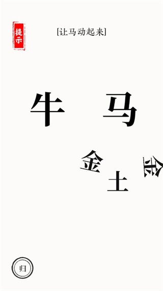 1. 第三关【让马动起来】,第一步点击【牛】字,随后能从其中拖出【土】字。