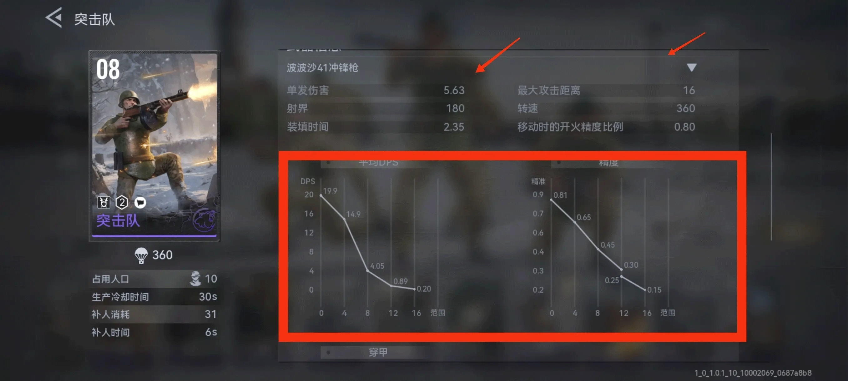 (二)还有一个颇为关键的信息便是武器精度。突击兵移动开火精度为0.8 ,相较于多数步兵的0.5要更高些。因此,在双方同时处于移动状态下进行对拼时,突击兵会占据优势。关于精度折线图所代表的含义,想必大家都清楚,即距离越远伤害越低,而且所有步兵的武器精度都是在距离为0时最为精确,伤害也最高。在游戏实际表现中,近距离挨着打能迅速将敌人击杀,可追杀逃跑的敌人时,却半天都打不死。这里的数据在与敌人对抗时具备部分效果,毕竟不同兵卡武器的精确度衰减情况各不相同。要是能够把握最佳的对敌数值,那么就能营造出我方攻击对方时相当精确,而对方攻击我方时却不太精确的局面,如此便可以拉开不同兵卡之间的输出差距,从而存在微操的空间。