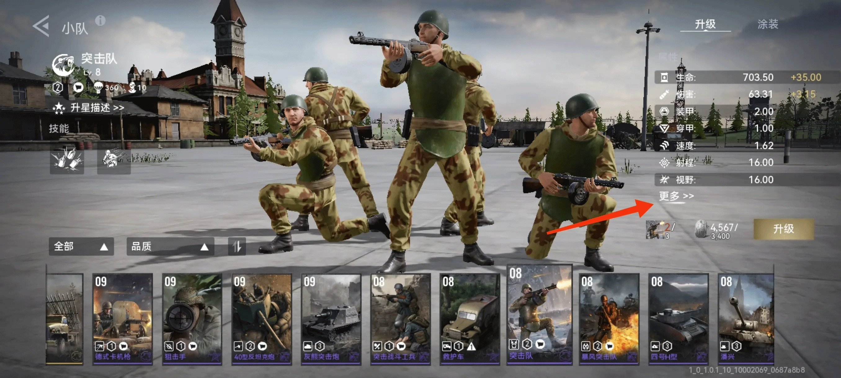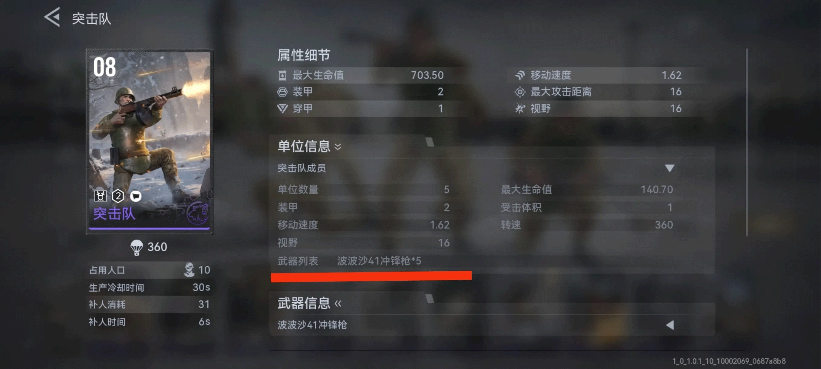 (一)从兵卡详细界面可知,突击队由5个单位组成,配备5把波波沙冲锋枪,单发伤害为5.6 。当突击兵受到突击兵攻击时,其单发承伤为5.6 - 2 = 3.6,实际承伤比例为3.6÷5.6 = 0.64,即拥有36%的伤害减免。而其他步兵被攻击时,承伤计算为(5.6 - 1)÷5.6 = 0.82,仅有18%的伤害减免。因此,在游戏实际表现中,突击队相较于其他步兵,在对拼时显得更“肉”。