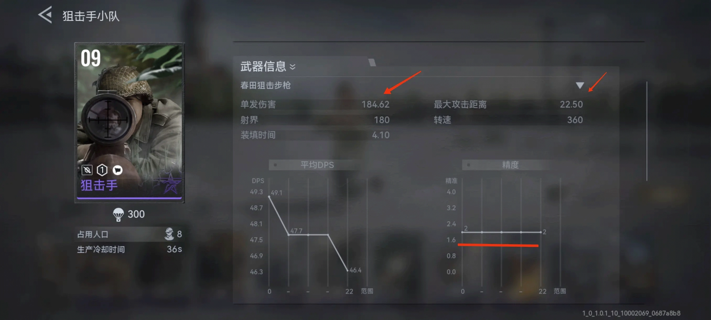 对比突击队的详细介绍,我简单讲讲狙击手。其兵卡界面显示伤害为35 ,但这只是综合输出能力,毕竟他仅有一个兵员。实际输出方面,从详情界面可知,武器春田狙击枪单发伤害达184 (多数步兵1单位血量在140左右),精度为2且不衰减,穿甲2 ,攻击范围22.5 。所以不少玩狙击手的玩家,能在敌方步兵和机枪手攻击范围(16)之外,一枪精准击杀一人。当然,狙击手缺点也突出,仅1个兵员,血量少,武器装填时间长,很难瞬间消灭一个兵卡组(不过要是能保证5 - 6个狙击手存活,遇到步兵就能秒杀),要是被载具盯上,基本就难逃厄运。