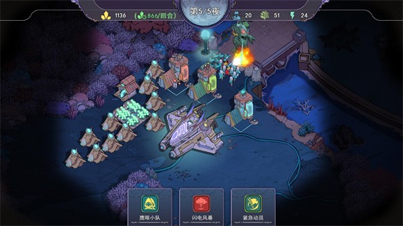 5、在战斗过程中,点击屏幕下方的卡牌,即可召唤部队或释放技能。待将所有敌人消灭后,便会进入白天阶段,此时可着手准备下一波防守。