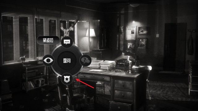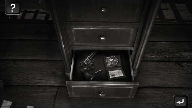 1. 轻点桌子右侧最底部的抽屉,即可获取警徽、一根香烟以及左轮手枪。
