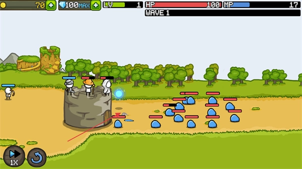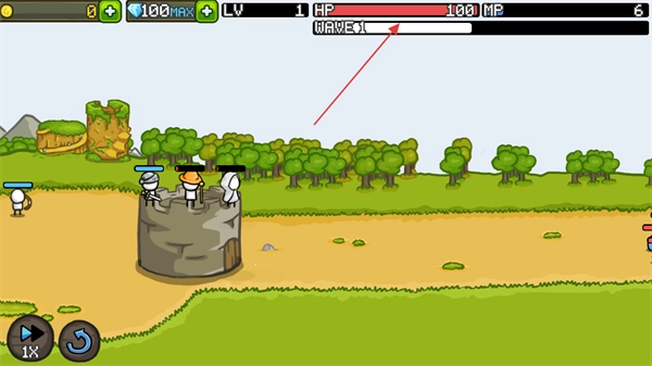 2、战斗打响,注意屏幕上方的WAVE1标识,此时第1波敌人开始进攻,城堡上的弓箭手将自动发起攻击。